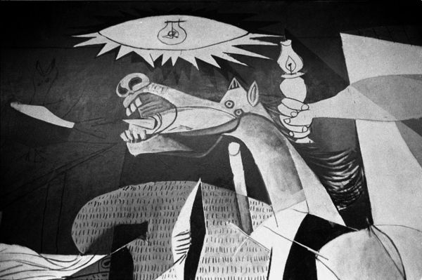 Il celeberrimo dipinto, realizzato da Pablo Picasso nel 1937, trae il suo titolo dall’omonima città basca rasa al suolo quello stesso anno nel corso della guerra civile spagnola. Troppo spesso lo si lascia irrelato tra le immagini di repertorio del libro di storia, relegandolo a icona e usurandone la carica espressiva. Sulla vasta scena, in un interno, o sottoscala, pende un sole elettrico sotto il quale domina il corpo di un cavallo straziato, con la bocca spalancata e la lingua aguzza. Una donna si affaccia dalla scala, osservando stupita e pietosa la tragedia e illuminandola con una lampada a olio. A destra s’intravede un edificio rettangolare in fiamme abitato da una figura umana che leva le mani al cielo. A sinistra spiccano le teste di un toro e di una madre con il figlio in braccio, anch’essa a bocca spalancata verso il cielo. Sul terreno giace il corpo di un uomo morto, con una spada spezzata e un fiore tra le mani.