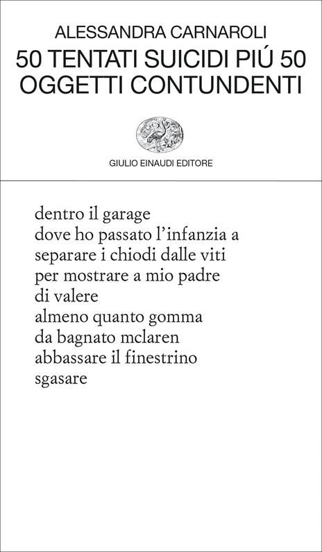 Sulla copertina bianca dell’ultimo libro di Alessandra Carnaroli (50 tentati suicidi più 50 oggetti contundenti, Collezione di poesia Einaudi, 2021) gli elementi che compongono il titolo disegnano un’immagine ambivalente, interpretabile quasi come una rappresentazione plastica della cifra profonda dell’opera. L’epanadiplosi a doppio livello, fonico e iconico (50 tentati suicidi più 50), con i numeri a perimetrare e a fortificare lo spazio delle lettere, evoca un universo blindato e schermato, retto da un principio di simmetria e corrispondenza formale tra le parti. Eppure, il 50 di chiusura è, anche, proteso in avanti, per legarsi logicamente a ciò che si trova nello spazio sottostante: “oggetti contundenti”. In un primo momento il lettore è indotto a pensare a cento “tentati suicidi” (50 più 50), per poi capire che si tratta, invece, di 50 “tentati suicidi” e 50 “oggetti contundenti” e che, probabilmente, i secondi sono lo strumento dei primi, i quali, in conclusione, potrebbero essere proprio, più che 100, 50 più 50. La disposizione degli elementi del titolo evoca, insomma, due aree di senso: la clausura e l’apertura, la simmetria e l’asimmetria; la serialità e la discontinuità; la fusione e la separazione. E 50 più 50 è il presupposto su cui si fonda l’intera struttura dell’opera, che è divisa in due parti, intitolate rispettivamente 50 tentati suicidi e 50 oggetti contundenti, identiche per estensione e per organizzazione interna: cinquanta testi numerati per ciascuna. A questa simmetria si contrappone la tendenziale irregolarità formale dei singoli testi e dei singoli versi, di lunghezza variabile e imprevedibile.