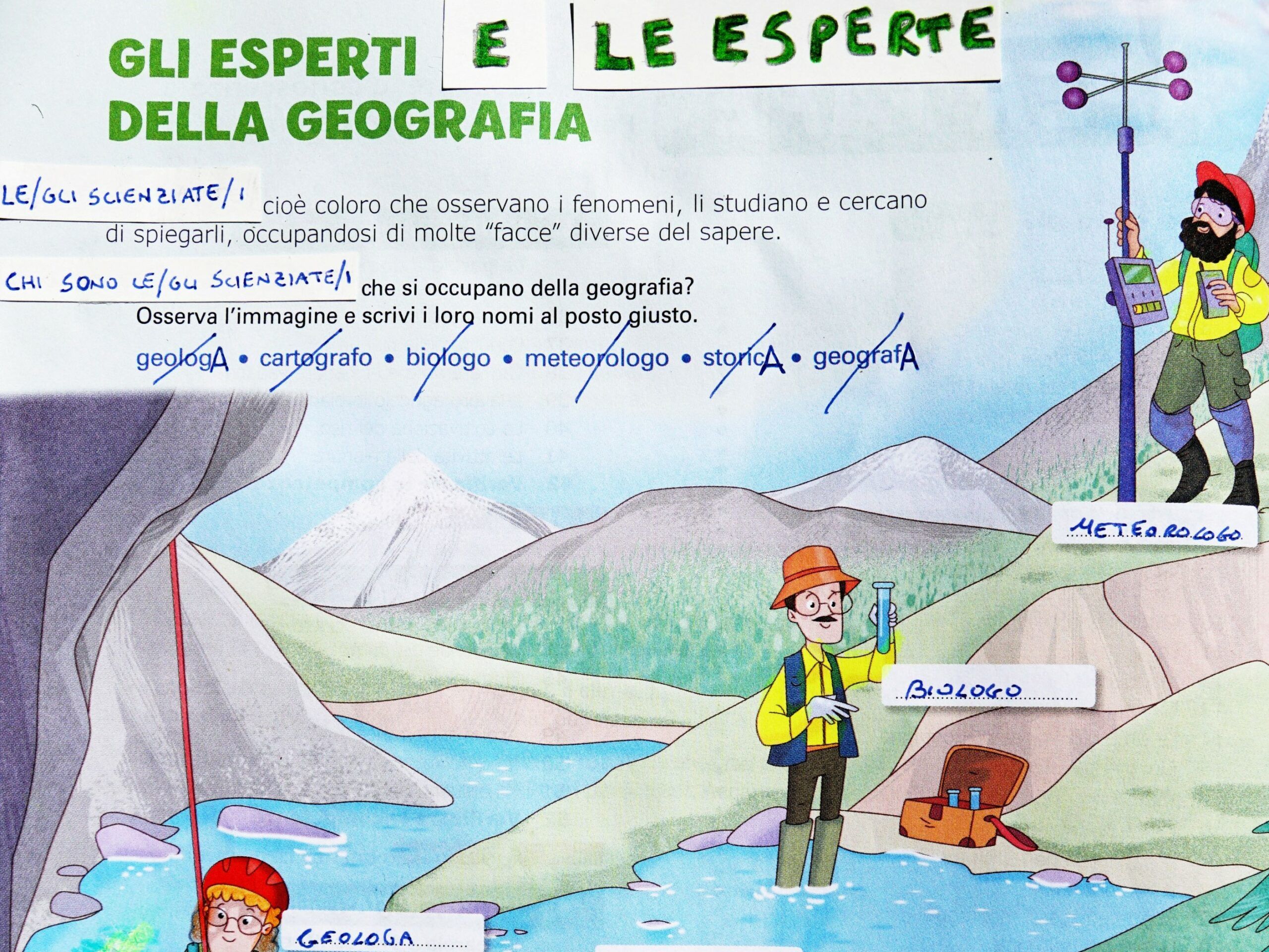 Peraltro, non bisogna dimenticare che l’età in cui si creano gli stereotipi non è certo quella dell’adolescenza. Come ha mostrato in modo incontrovertibile Irene Biemmi, in particolare in “Educazione sessista”, sono le semplici e spesso banali storie con le quali si impara a leggere – storie di donne che in casa accudiscono i bambini mentre i maschi scoprono nuovi mondi – che cominciano a costruire il pregiudizio, la discriminazione, la violenza. Ancor più quando queste storie si saldano all’apprendimento acritico di regole grammaticali imitate senza interrogarsi sul loro valore. Fu mio padre, ad esempio a mettermi in mano il libro da cui è tratta la citazione iniziale di questo articolo. Avevo nove anni, ma fui perfettamente in grado di capire. E nove anni aveva anche mia figlia quando, accompagnata da una maestra sensibile e rispettosa, si permise di correggere il suo libro di testo, come si vede nell’illustrazione iniziale: perché non capiva come mai le donne dovessero rientrare nella categoria maschile sovraestesa di “scienziati”, quando esiste il femminile “scienziate”.