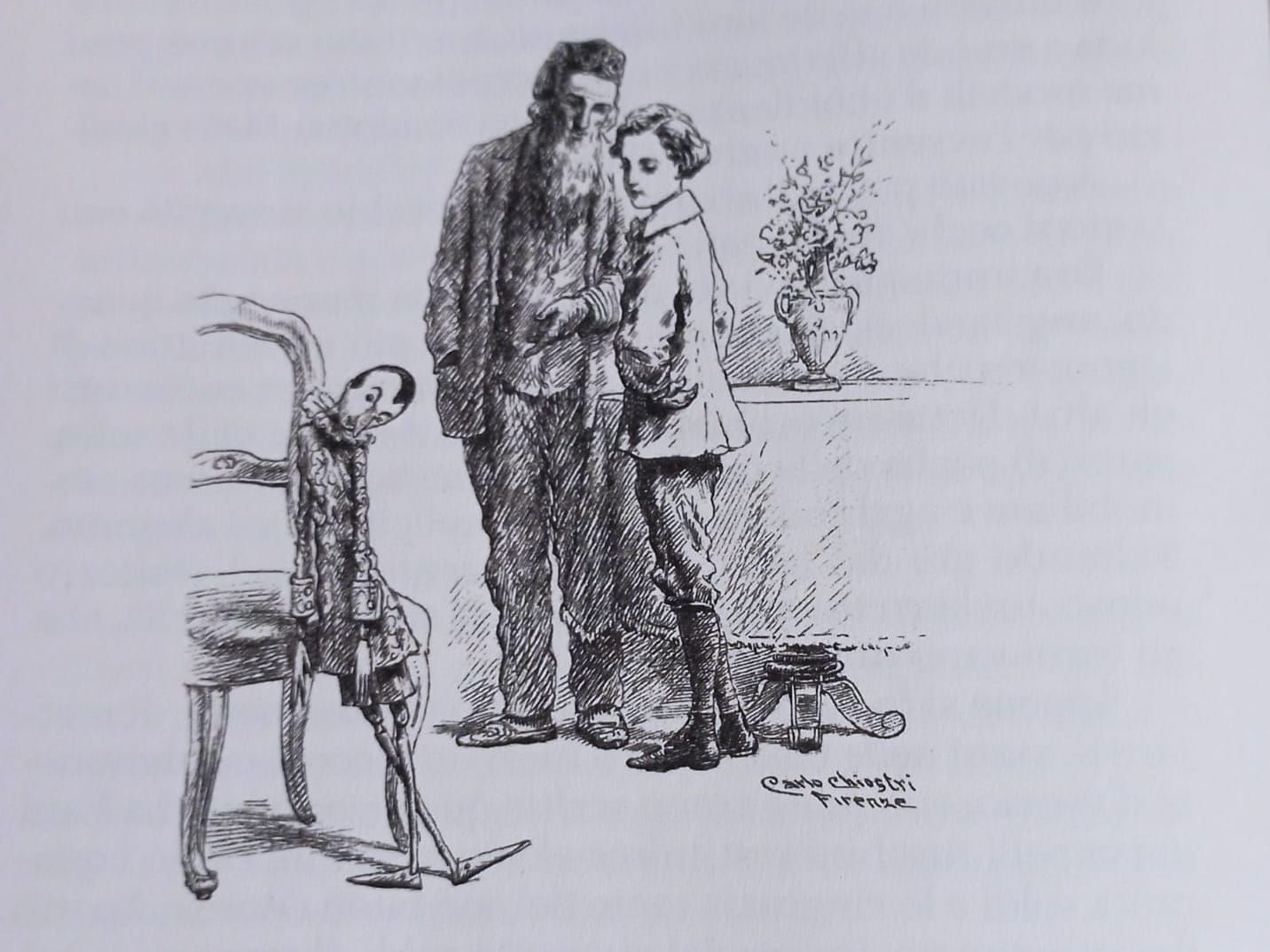 « […] quando Geppetto provò ad accendere il fuoco non ci riuscì perché la legna era bagnata. Loro due stavano per morirsi dal freddo; dopo un po’ gli venne in mente un’idea sia a Pinocchio che a Geppetto. Presero il burattino del vecchio Pinocchio e lo bruciarono, ci fecero un grande fuoco e si riscaldarono».