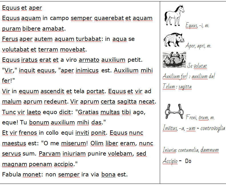 Il sintetico esempio operativo che segue si pone come obiettivo l’introduzione degli aggettivi della prima classe per gli studenti del I anno del Liceo, a metà circa del I quadrimestre, dopo che abbiano già studiato le prime due declinazioni, il tempo presente e imperfetto dell’indicativo e alcuni pronomi. In questo caso presentiamo la rielaborazione di una favola di Fedro (per un rapido confronto con l’originale, si può consultare la Perseus Digital Library), corredata da alcune semplici attività da svolgersi immediatamente in classe con la guida del docente. Il testo utilizza elementi grammaticali e lessicali per la maggior parte noti agli studenti o generalmente comprensibili, allo scopo di riepilogare il pregresso e facilitare il focus sulla novità. Inoltre, può essere proficuo inserire Equus et aper all’interno di un modulo interdisciplinare sulla favola (argomento trattato al I anno in Lingua e letteratura italiana), permettendo così anche il collegamento con altri nodi concettuali trattati nel curricolo.